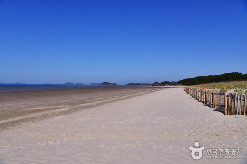 충남 태안군 안면읍 광지길에 자리한 꽃지해변은 5km에 이르는 백사장과 할배바위, 할매바위가 어우러져 그림 같은 풍광을 보여준다. 2개의 바위 너머로 붉게 물드는 낙조는 태안을 상징하는 아름다운 풍광 중 으뜸으로 꼽힌다.